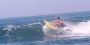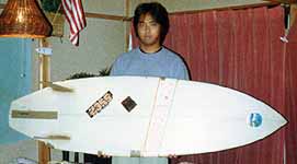 サーフボードは高いと思います?確かに日本では高いですよね。最近、ノンブランドで10万円以下の物もありますが、名の通ったシェイパー(サーフボードを削る人)となるとその価格は天井知らず。私は前に一度、アルメリックと言うシェイパーのボードをNETの海外通販で買ったことがあります。日本での価格は有名スポーツ店で15万円、私が買ったのは6万円位でした。為替の関係で値段も上下しますが、それでも二分の一でした。しかし、それにまた価格の二分の一が送料、保険、関税にかかります。つまり9万円弱になっていまいました。それでも高い。ならば、自分で作ってしまおう。昔お金の無いときに一度作ったことがあります。まず古いボードの表面に傷を付けてからカッターで切れ目を入れてひっぺがす感じで表面をはぎ取ります。軍手は忘れずに後で痒くて大変な事になりますよ。そして、フィンなどはきれいに取っておいて下さい。はがし終えたら削ります。大まかにアウトラインをきめ、カッターなので切って紙ヤスリで形を整えます。そして、グラスウールを巻いてFRP樹脂を流す様にかけてのばしていきます。裏も同じように出来たら、表面を紙ヤスリで整えます。フィンを固定して下さい。最後にコンパウンドなどで磨けばほら出来上がり。材料は東急ハンズや日曜大工店で揃います。と、言葉で簡単に言ったものの、凄く大変、痒くなるし、粉だらけ、手はべたべた。出来たボードは表面ボコボコ、左右がいびつ、ひどい代物でした。しかし波に乗るとうれし、楽しい、違った意味でこれがサーフィンの醍醐味なんて感じがします。でも、やっぱり買った物にはかないませんね。自分で作ってみて初めて値段の謎がわかります。サーフボードは今時珍しく職人技が光る手作り製品なのです。